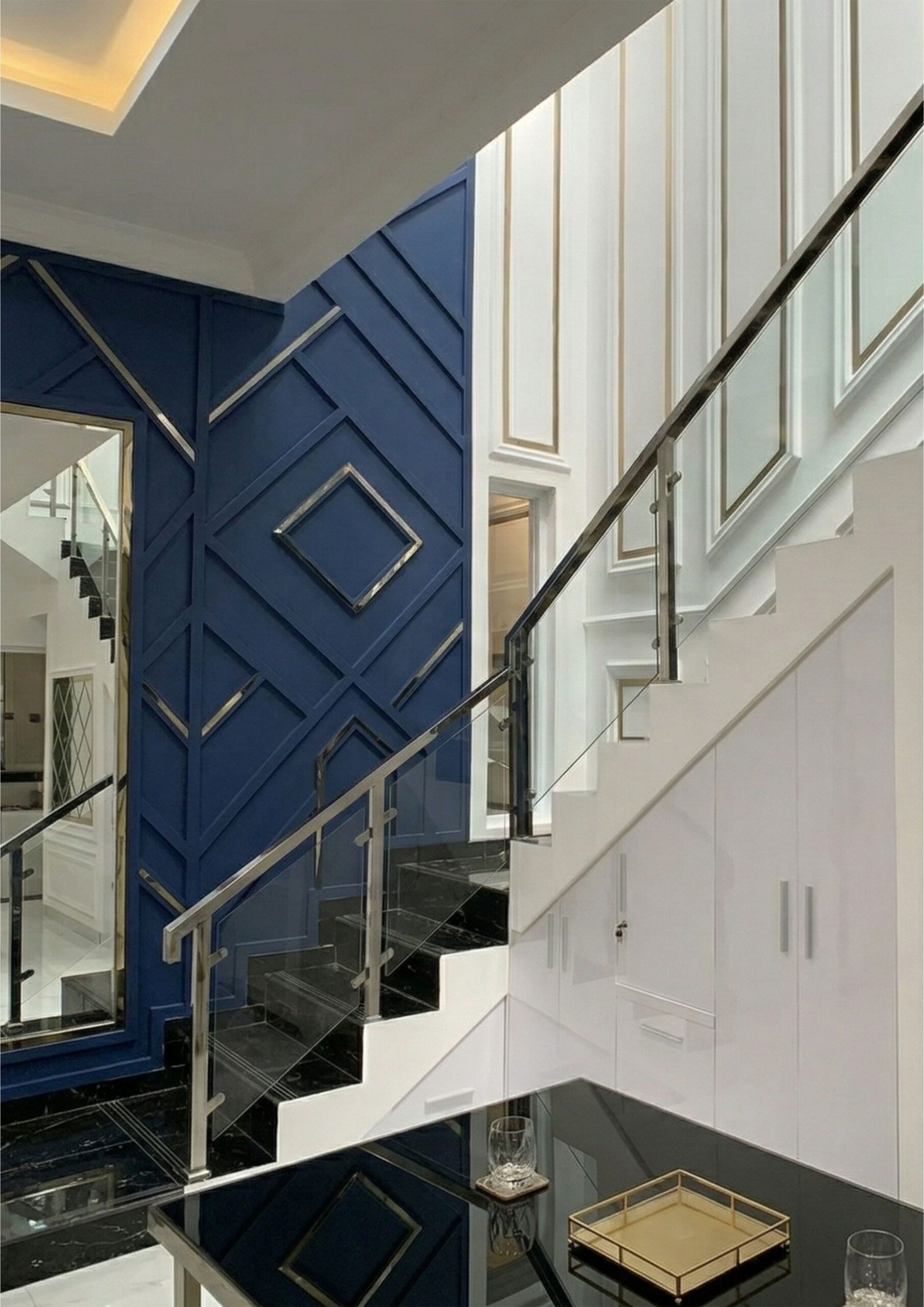 Area Tangga yang polos membuat rumah menjadi monoton, dengan tambahan aksen desain akan membuat rumah tampak luas, mewah, nyaman, dan hangat